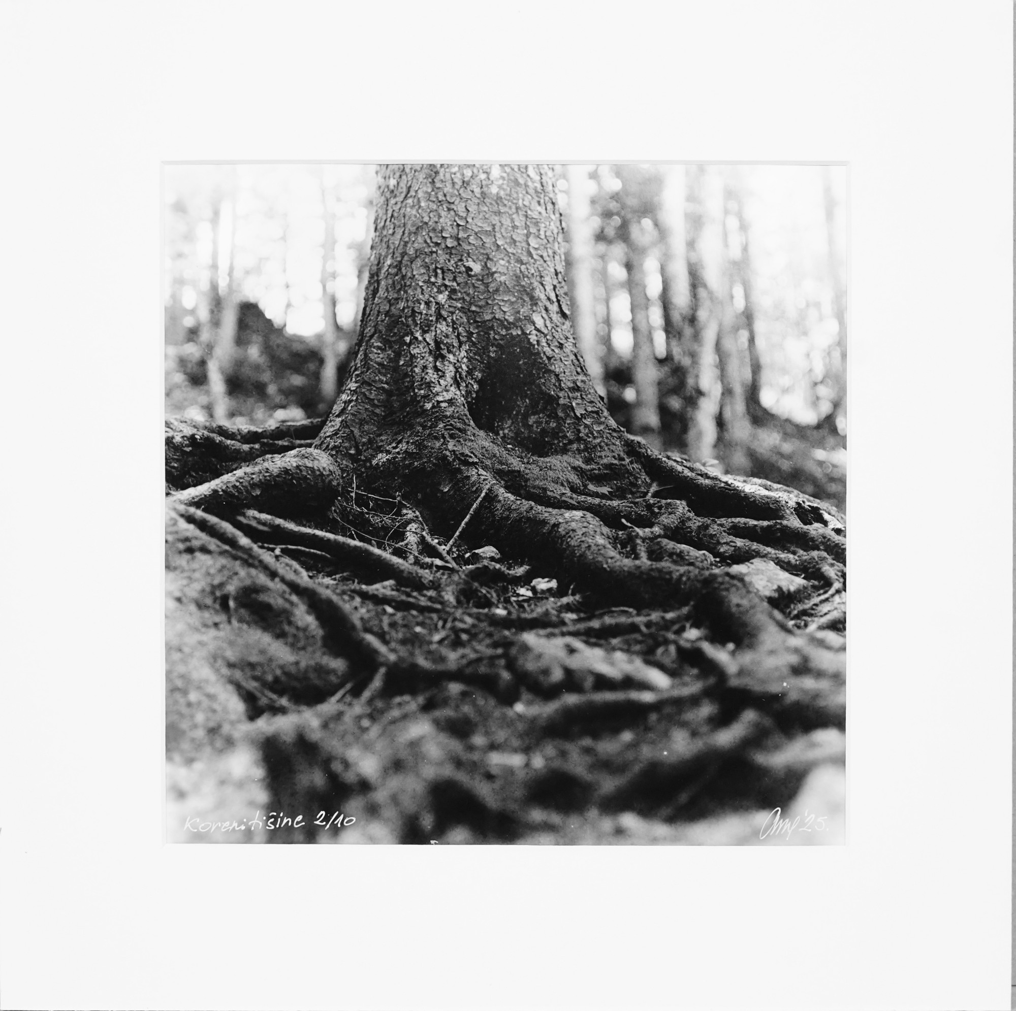 Koreni tišine je intimna analogna fotografija, ručno izrađena klasičnom silver gelatin tehnikom na Ilford Multigrade RC papiru, koja istražuje sirovu moć i mir šume. Kompozicija se fokusira na snažno, prizemljeno stablo čiji koreni prodiru u zemlju, ali i izranjaju, svedočeći o vitalnosti i otpornosti prirode.